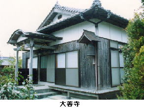 ■沿革 法華信者の貞弘城妙が、当時岩永(秋芳町)の常在寺住職であった佐々木日一に帰依し、大井穴観音での祈祷会が縁となり、地元の信者の希望により、城妙が開基となって、日一を開山として迎え、昭和二十四年(1949)大善教会が発足した。同時に同教会で城妙が大善託児所を開設した。同五十四年(1979)に託児所が正式の保育園として唐ノ嶋へ移転し、大井保育園となった後、同五十六年(1981)堂宇が再建され、一妙山大善寺と称するようになった。